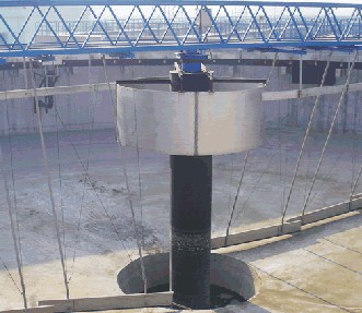 刮泥机,是一种排泥设备。组成部分:刮泥机由桁车、刮泥耙、撇渣板、驱动装置和自控柜等到组成。分类:刮泥机主要有中心传动刮泥机、周边传动刮泥机。中心传动刮泥机主要由工作桥、传动装置、稳流筒、传动轴、刮臂、刮泥板等组成。该机设有横跨池子的固定平台,工作时其整机载荷都作用在工作桥中心;污水经池中心稳流筒均流到四周。随着过流面积增大而流速降低,污水中的沉淀物沉淀于池底,刮泥机将沉淀的污泥刮集到中心集泥坑中,利用水压将其从污泥管中排出。该机结构简单,传动平稳,动力消耗低,刮泥效果好,是一种理想的排泥设备;周边传动刮泥机用于城市污水处理厂、自来水厂以及工业废水处理中辐流式圆形沉淀池和浓缩池中,排除沉降在池底的污泥和撇除池面的浮渣。应用领域:刮泥机主要应用于钢铁、冶金、矿山、水处理等行业。